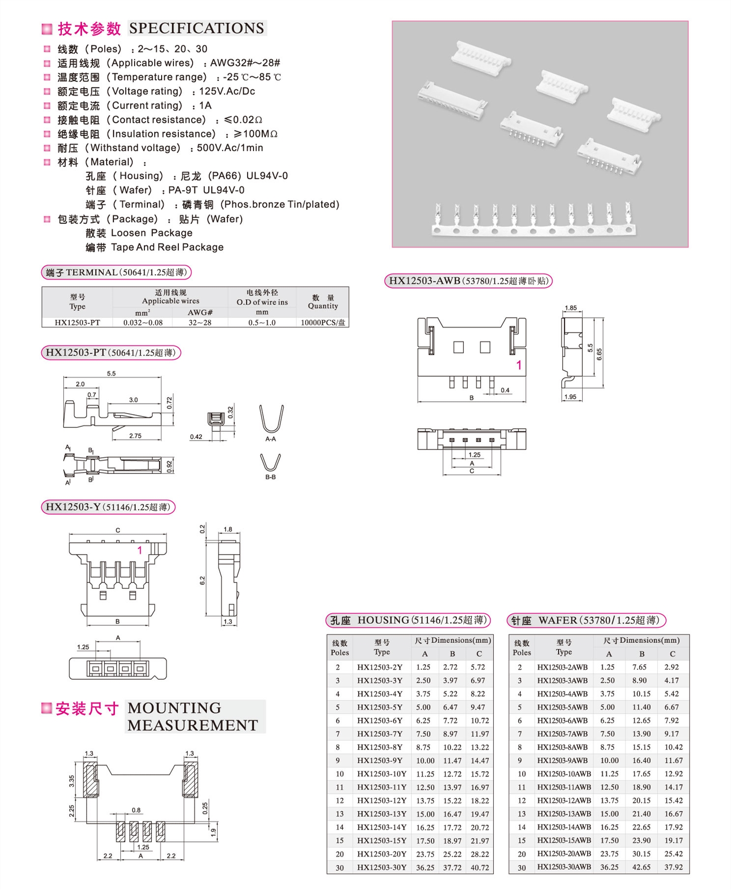 奎文HX12503-(1.25超薄 SMT/51146、53780)- 贴片式连接器(1.25mm)